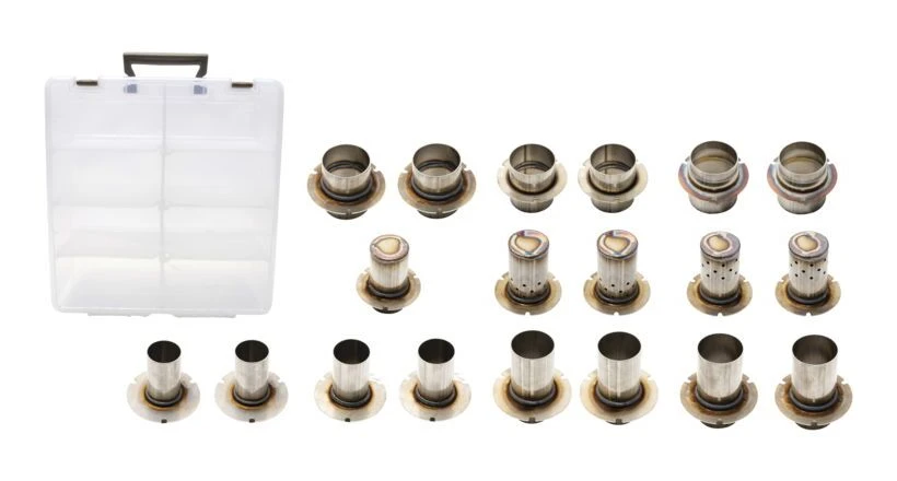 The Power Tune XTO Insert kit was developed for tuning power and sound. The dealer kit includes two each of the 1.375″, 1.5″, 1.625″, 1.75″ plugged front with 3.5mm holes, 1.75″ plugged rear with 3.5mm holes,1.875″, 2″, 2.25″, and one 1.75″ plugged. This allows the exhaust to be perfectly tuned, both sound and power.